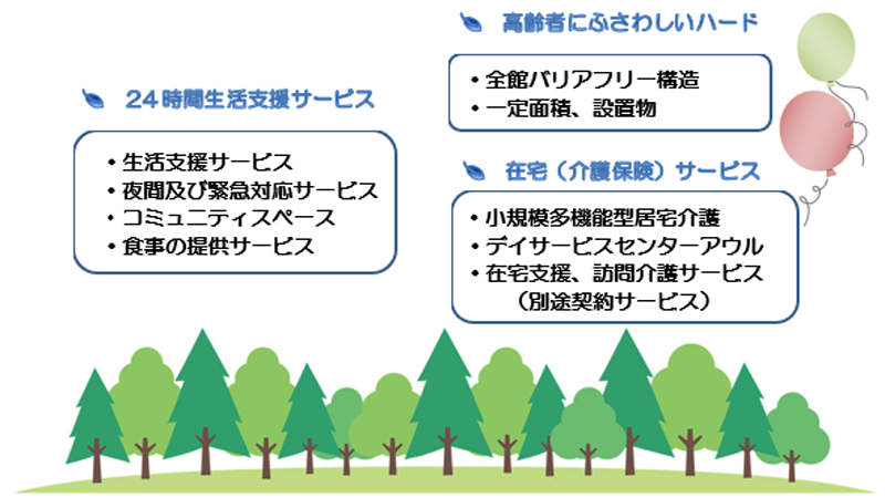 「サービス付き高齢者向け住宅」とは 設備・居住スペースの諸条件を満たした上で、職員が安否確認 サービスおよび生活相談サービスを提供することにより、高齢者が安心して暮らす事ができる賃貸住宅です